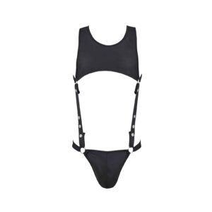 O body Adam é feito de couro ecológico preto. É uma combinação ousada de slip sedutor e um top justo, unidos por suspensórios. O material macio garante o conforto de utilização, e a elevada qualidade de fabrico é uma garantia da durabilidade do produto. Este conjunto sensual e elegante realça os atributos da figura masculina e faz com que cada homem se sinta confiante e com estilo.