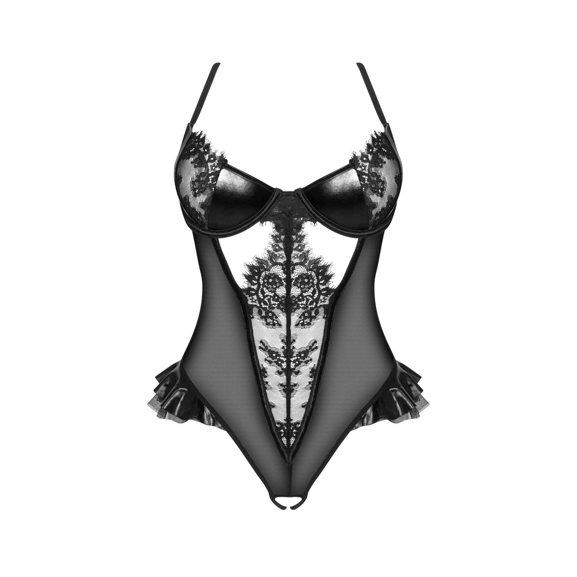 Este deslumbrante body da coleção Rafaella é confeccionado com uma combinação de renda tule e material wetlook que acentua a figura ao mesmo tempo que lhe confere elegância e sensualidade. As copas são adornadas com renda delicada realçando subtilmente o busto de uma forma sedutora mas refinada. A frente aberta decorada com inserções de tule e renda acrescenta sofisticação. As costas apresentam folhos divertidos que dão um toque feminino para completar o look. Este body é a mistura perfeita de elegância e sensualidade tornando-o numa escolha ideal para noites românticas e ocasiões especiais.Material: O tule delicado e as inserções em wetlook realçam lindamente as curvas.Copas: Adornadas com renda que realçam subtilmente o busto.Design: Frente aberta com pormenores de renda e recorte.Costas: Decoradas com folhos divertidos que dão um leve toque feminino.Alças ajustáveis: Garantem um ajuste perfeito.Fecho: Fecho de gancho e olho na parte de trás para um uso confortável.Utilização: Perfeito para ocasiões especiais ou noites sensuais.Pronta para oferecer: O body vem numa caixa elegante com a imagem do produto.A renda e os detalhes subtis farão com que se sinta bonita e sensual.Cavalheiros Ofereça algo que irá encantar a sua cara-metade.Tamanhos: S/M e L/XL Tamanho S/M: (Seios: 81-91 cm B-C Cintura: 56-71 cm Anca: 85-97 cm) Tamanho L/XL: (Peito: 91-107 cm C-D Cintura: 71-91 cm Anca: 97-112 cm)Material: 88% poliéster 12% elastano