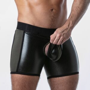 Calções boxer de corte quadrado em pele sintética perfurada com detalhes contrastantes.Frente amovívelGlory HoleFivela em D no interior do cós para fecho ‘RUB IT HARNESSFecho de correr funcional na parte de trásCOMPOSIÇÃOTecido principal: 86% poliéster – 14% elastanoTecido secundário: 95% algodão – 5% elastanoCUIDADOSLavagem à máquina máx. 30ºC / 86ºFNão usar lixíviaNão secar na máquina de secar roupaNão passar a ferroNão limpar a seco