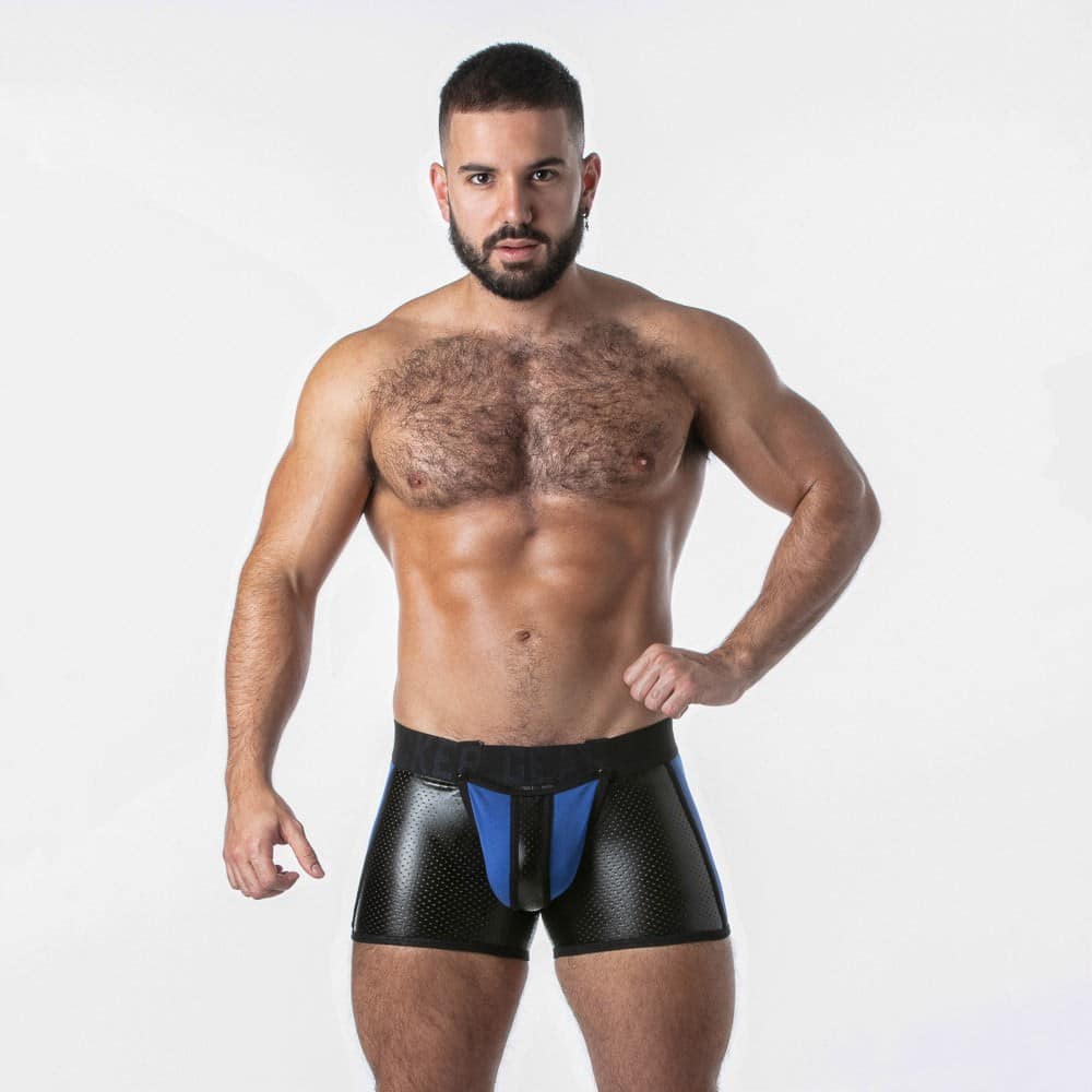 Calções boxer de corte quadrado em pele sintética perfurada com pormenores em contraste.Frente amovívelGlory holeFivela em D no interior do cós para fixação ‘RUB IT HARNESSFecho de correr funcional na parte de trásCOMPOSIÇÃOTecido principal: 86% poliéster – 14% elastanoTecido secundário: 95% algodão – 5% elastanoCUIDADOSLavagem à máquina máx. 30ºC / 86ºFNão usar lixíviaNão secar na máquina de secar roupaNão passar a ferroNão limpar a seco