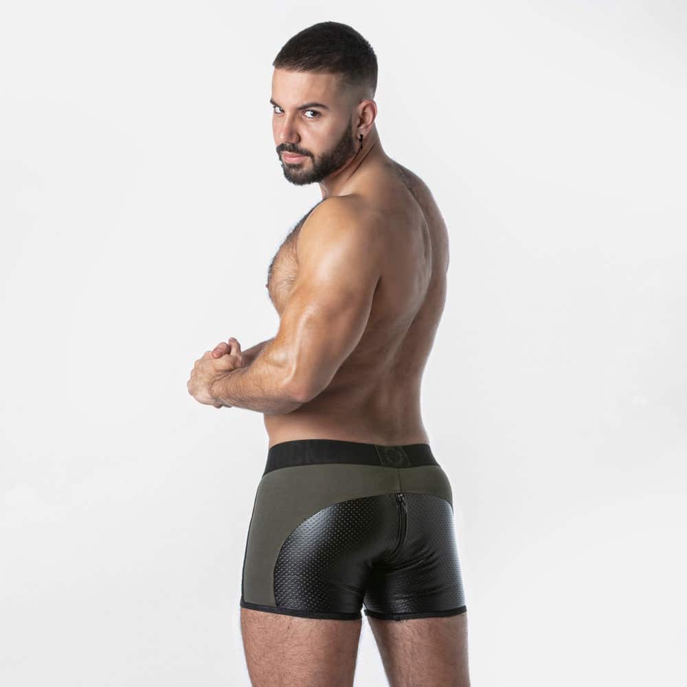 Calções boxer de corte quadrado em pele sintética perfurada com pormenores em contraste.Frente amovívelGlory holeFivela em D no interior do cós para fixação ‘RUB IT HARNESSFecho de correr funcional na parte de trásCOMPOSIÇÃOTecido principal: 86% poliéster – 14% elastanoTecido secundário: 95% algodão – 5% elastanoCUIDADOSLavagem à máquina máx. 30ºC / 86ºFNão usar lixíviaNão secar na máquina de secar roupaNão passar a ferroNão limpar a seco