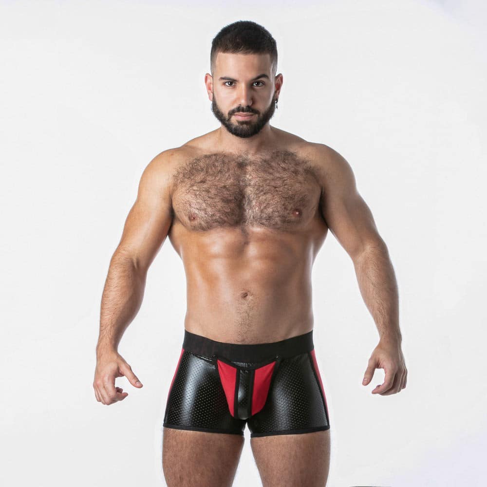 Calções boxer de corte quadrado em pele sintética perfurada com pormenores em contraste.Frente amovívelGlory holeFivela em D no interior do cós para fixação ‘RUB IT HARNESSFecho de correr funcional na parte de trásCOMPOSIÇÃOTecido principal: 86% poliéster – 14% elastanoTecido secundário: 95% algodão – 5% elastanoCUIDADOSLavagem à máquina máx. 30ºC / 86ºFNão usar lixíviaNão secar na máquina de secar roupaNão passar a ferroNão limpar a seco
