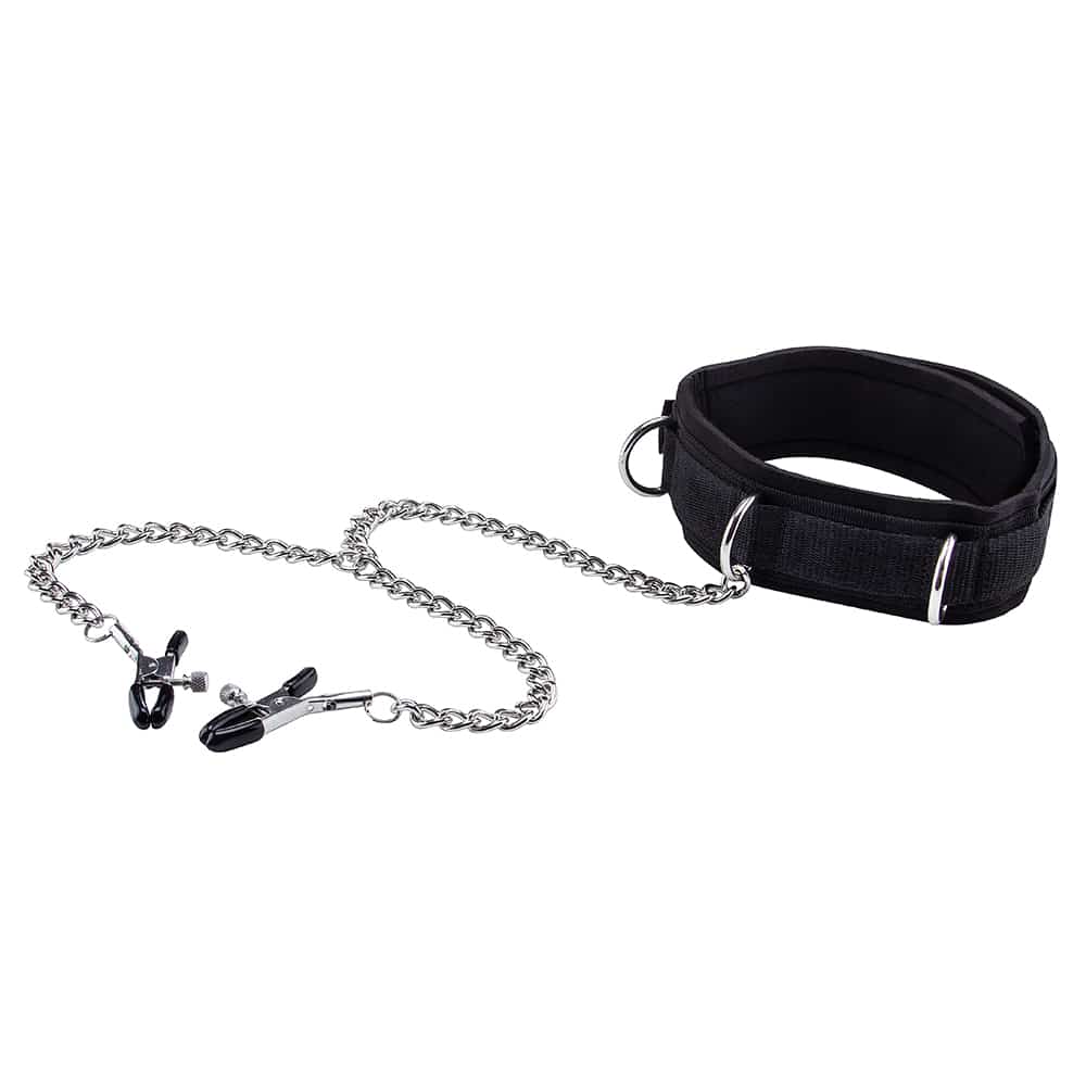 MATERIAL:Camurça, Velcro, Metal.DESCRIÇÃO:Se você gosta de dominar o seu amante ou render-se em submissão total, este é o conjunto perfeito. Este brinquedo apresenta uma coleira ajustável para o pescoço, uma trela em corrente e umas pinças ajustáveis para os mamilos. Estas peças, feitas em camurça e velcro e com correntes…