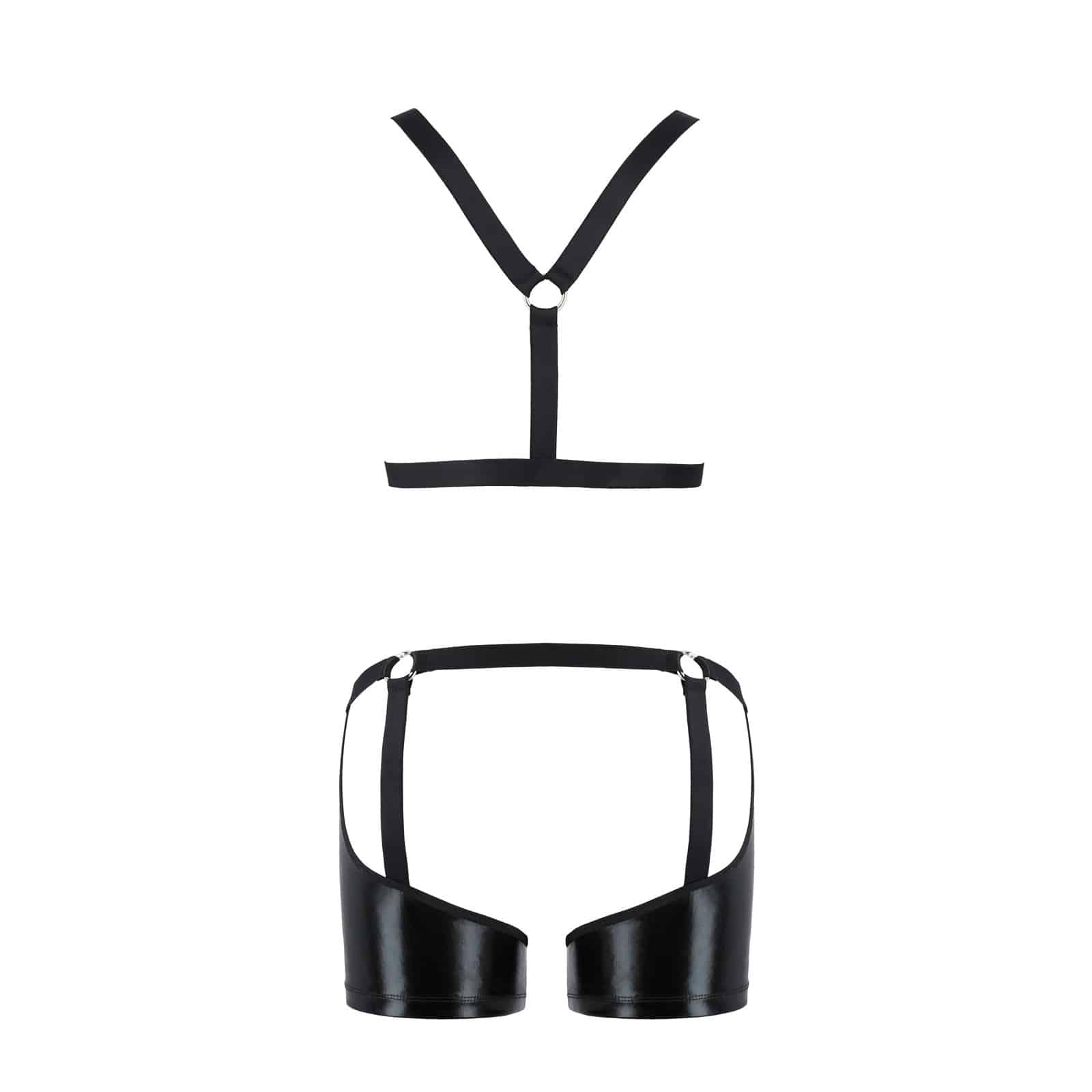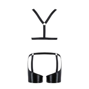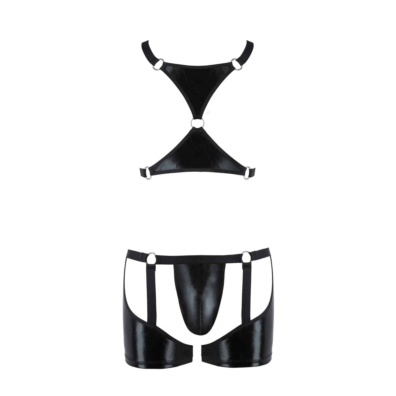 O conjunto Aron é uma proposta de lingerie erótica para homem, com um estilo wet look.O design sensual e os materiais confortáveis e resistentes fazem deste modelo uma excelente escolha para todos os homens ousados que procuram sensações intensas. A lingerie é feita de malha preta brilhante, combinada com anéis decorativos de metal.O conjunto inclui tiras para as coxas, uma bolsa para o pénis e um arnês para o tronco.