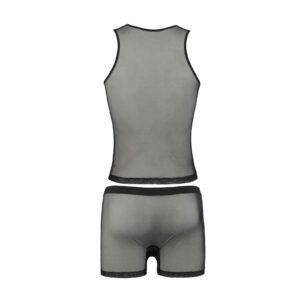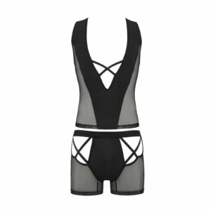 Se quiser apimentar um pouco a sua vida erótica, o conjunto Oscar vai certamente interessá-la. É composto por um colete fino e uns boxers sensuais, feitos de uma combinação de microfibra macia e tule preto. As tiras decorativas cruzadas no colete e nos boxers realçam a silhueta e dão carácter a este conjunto extremamente sensual. O conjunto Oscar é uma escolha ideal para dançarinos eróticos e pessoas que querem despertar a imaginação no quarto.