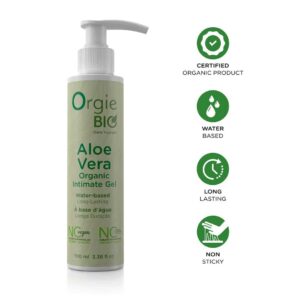 O gel íntimo à base de água Orgie Bio Aloe Vera é formulado com sumo de folhas de Aloe Barbadensis e outros ingredientes de origem org-nica e sustentável, livre de produtos químicos, todos certificados naturais e veganos. Não pegajoso, fácil de limpar e lavar. Produto vegano e natural certificado pela Eco-Control?.
