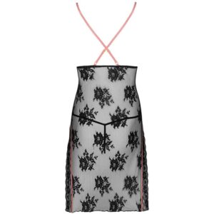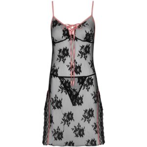 A coleção Karonin Dubarry é um conjunto composto por uma camisola sensual e uma tanga preta combinando. O conjunto é feito de renda macia e vazada e decorado adicionalmente com uma sutil fita rosa pó amarrada no busto. Uma combinação tão contrastante de rosa doce e preto forte faz com que a roupa acrescente coragem e autoconfiança. Por sua vez, o material do conjunto garante que sua usuária se sinta o melhor possível em seu próprio corpo. A renda é confeccionada em poliamida agradável ao toque, que não risca e se adapta bem ao formato da figura feminina.