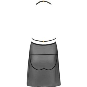 A t-shirt do conjunto Malviami é uma impressionante combinação de materiais clássicos, com alças sensuais e predatórias que sustentam o busto e acrescentam carácter. A parte superior do look é confeccionada em renda feminina, e a parte inferior em malha densa, chegando até o meio da coxa. A camisa é decotada tanto na frente quanto nas costas. Sob o material semitransparente, você pode ver uma tanga de corte original com inserção de renda e tiras circundando as nádegas. Graças à clássica cor preta, o conjunto será perfeito para qualquer ocasião e ajudará a mascarar pequenas imperfeições da figura, ao mesmo tempo que realça as suas vantagens.