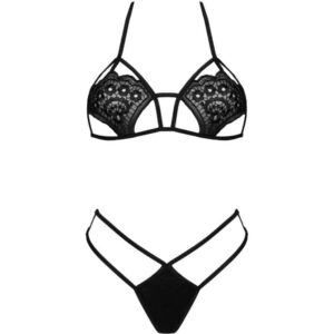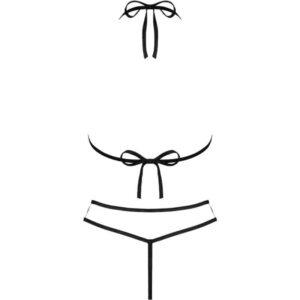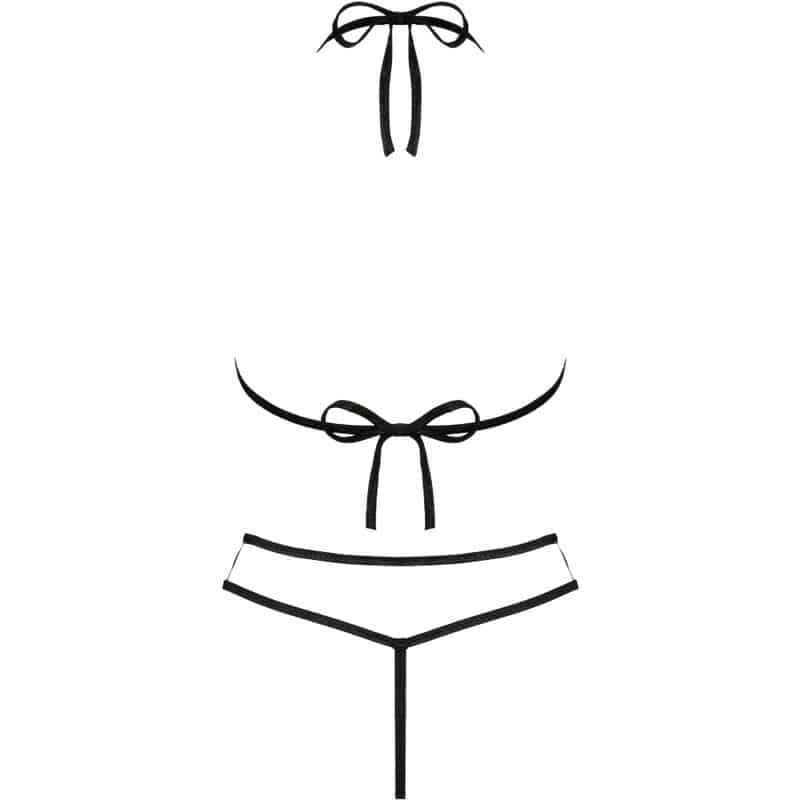 O conjunto incomum e picante de Jimena consiste em um sutiã e uma tanga combinando. As tiras pretas acentuam ainda mais seu caráter sedutor.