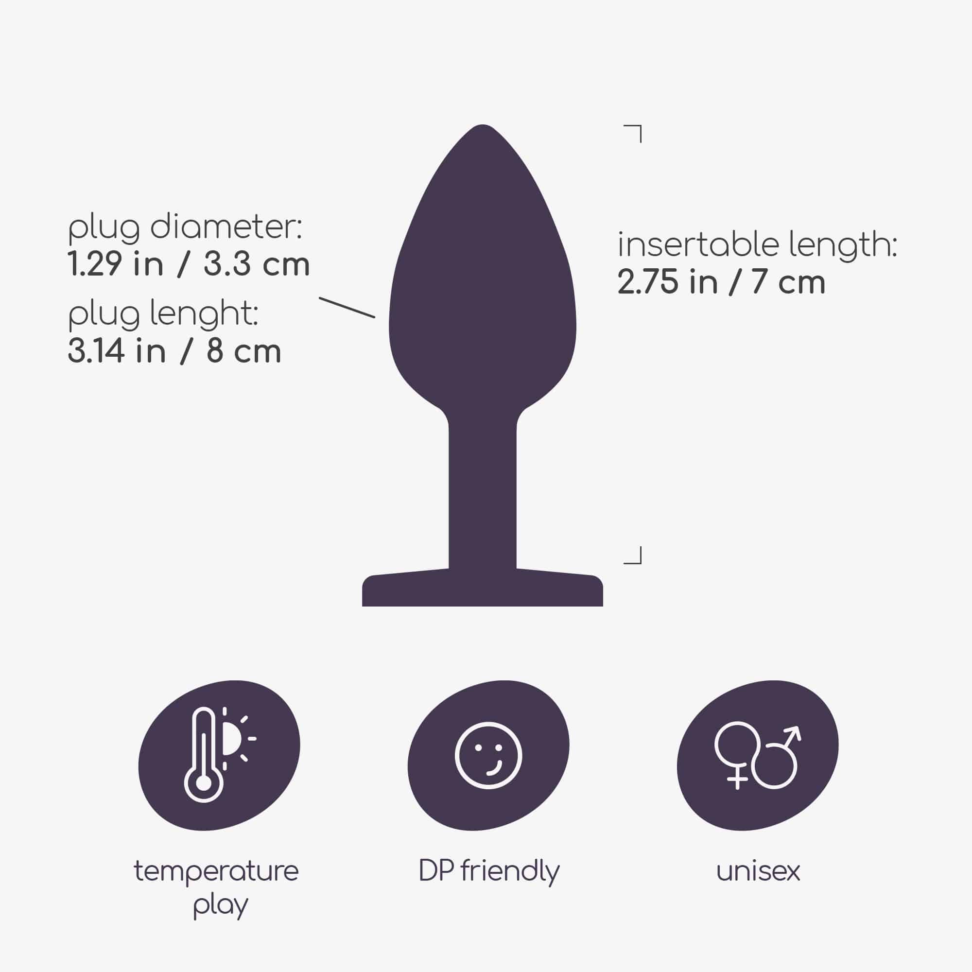 strip tease e como estimulação extra durante a penetração vaginal.O metal é perfeito para jogos de temperatura, submerja o seu plug em água quente ou fria para novas e excitantes experiências!Use com lubrificante para melhor inserção. Escolha os lubrificantes Crushious na versão Waterbased ou Anal para ainda melhores resultados.Lave o seu plug com água morna e sabão neutro após o uso, pode também utilizar um detergente antibacteriano específico para brinquedos.Apto para iniciantes e utilizadores mais experientes.Dimensões:Comprimento Inserível: 7cm; Diâmetro: 3,3cm.