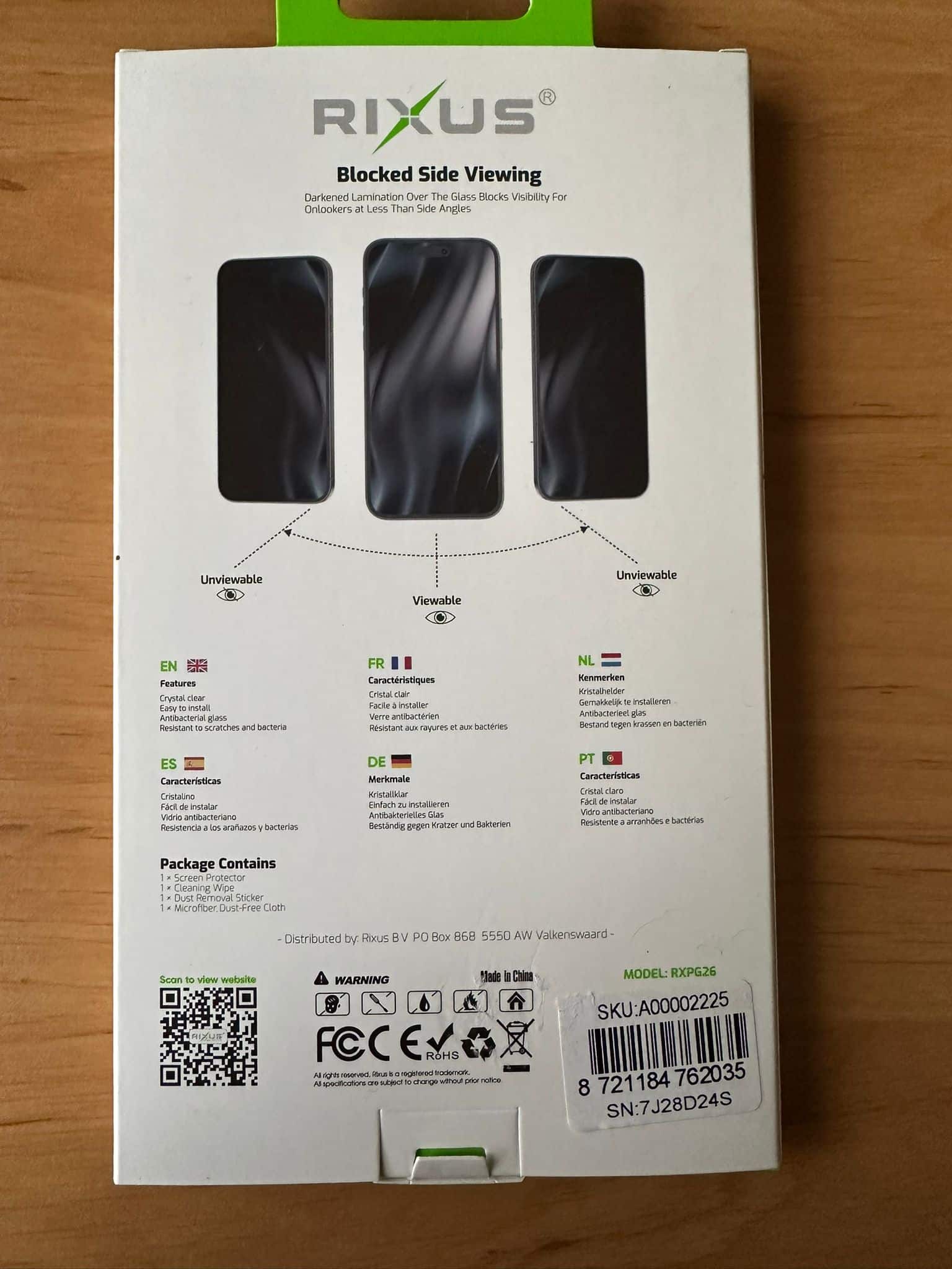 A película de privacidade em vidro temperado da Rixus protege o seu iPhone contra quedas, arranhões e choques, além de garantir a sua privacidade em locais públicos. Com a tecnologia de privacidade, a visibilidade do ecrã é limitada a quem está diretamente à frente do dispositivo, bloqueando olhares curiosos de pessoas ao lado. A película é fácil de aplicar e remover, sem deixar vestígios, e não compromete a sensibilidade do ecrã ao toque.