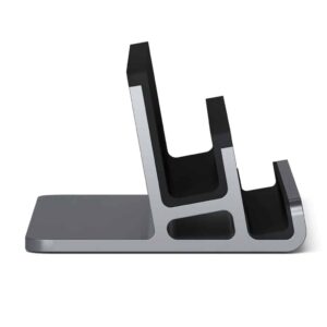 Stand para arrumar na vertical 2 equipamentos em simultâneo, tablets, portáteis ou ainda smartphones. Tem partes revestidas a silicone nos pontos de apoio para proteger de riscos e robustez suficiente para aguentar com o peso dos equipamentos.