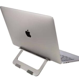 Stand em alumínio que fecha e fica espalmado, para maior portabilidade. Proporciona ao portátil uma inclinação de trabalho mais confortável.